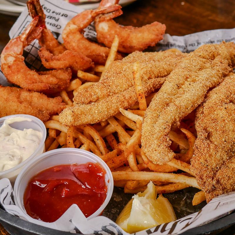 Hand-Breaded Gulf Shrimp and Catfish served with Fries | Small (2/3) $12.95 | Large (3/5) $15.95